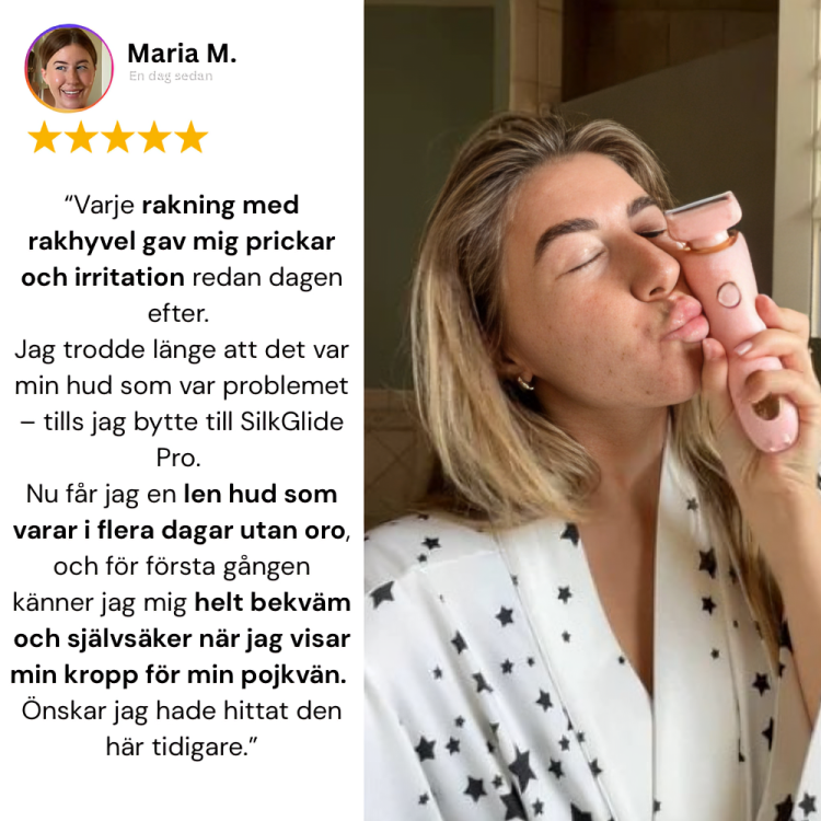 Jag har alltid haft känslig hud.Och varje gång jag försökte raka mig – speciellt där nere – blev det samma sak. Röda prickar. Klåda. Obekvämt. Jag brukade tro att det var normalt. Att det skulle vara så. Men det gjorde att jag började undvika rakning, bara för att slippa konsekvenserna. Sen hittade jag SilkGlide Pro. Och ärligt – det förändrade hela min rutin. Ingen irritation. Ingen stress. Bara silkeslen hud, på ett sätt som kändes skonsamt – inte som en kamp. Jag använder den nu både i duschen och snabbt på torr hud när jag har bråttom. Och det känns som att jag äntligen hittat något som passar mig – inte tvärtom.